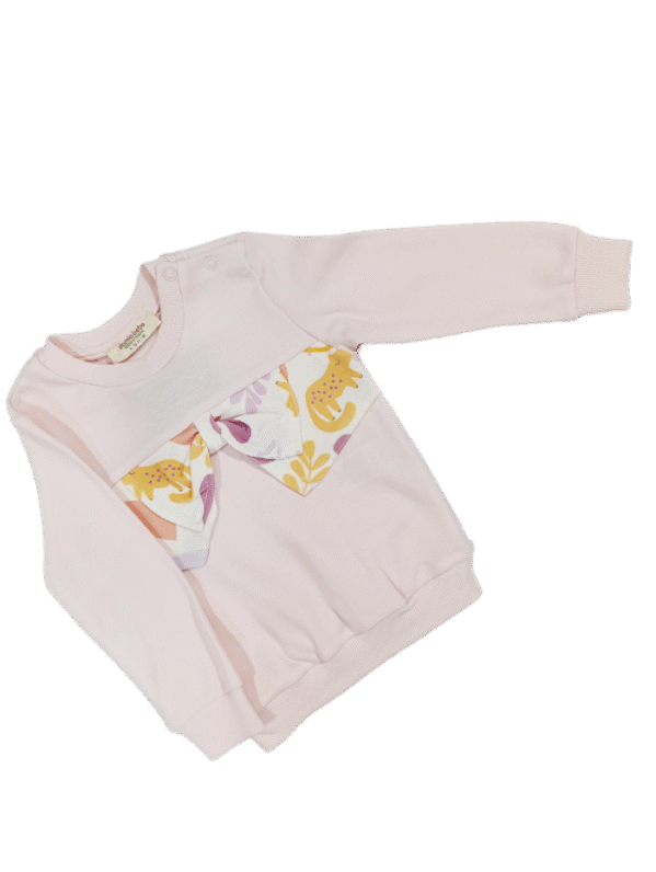 Setul din imagine este un costum pentru copii, realizat din bumbac 100% și fabricat în Turcia. Acesta conține un hanorac roz pal cu închidere la capse și mâneci lungi, alături de pantaloni cu talie elastică și imprimeuri colorate, viu și jucăuș, cu animale și forme botanice. Materialul natural, moale și respirabil, asigură confortul optim pentru pielea delicată a copilului, fiind ideal pentru purtare zilnică, joacă sau relaxare. Designul modern și vesel aduce un plus de culoare garderobei copilului, iar croiala practică permite libertate deplină de mișcare, fără riscul de iritații sau disconfort.