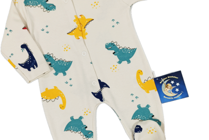 Această salopetă drăgălașă pentru bebeluși este realizată integral din bumbac moale și respirabil, ideal pentru pielea sensibilă a celor mici. Modelul cu mâneci lungi și botoșei acoperiți oferă confort atât ziua, cât și noaptea, iar imprimeul colorat cu dinozauri veseli transformă orice moment într-o joacă plină de zâmbete!