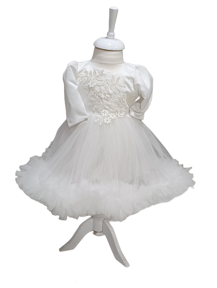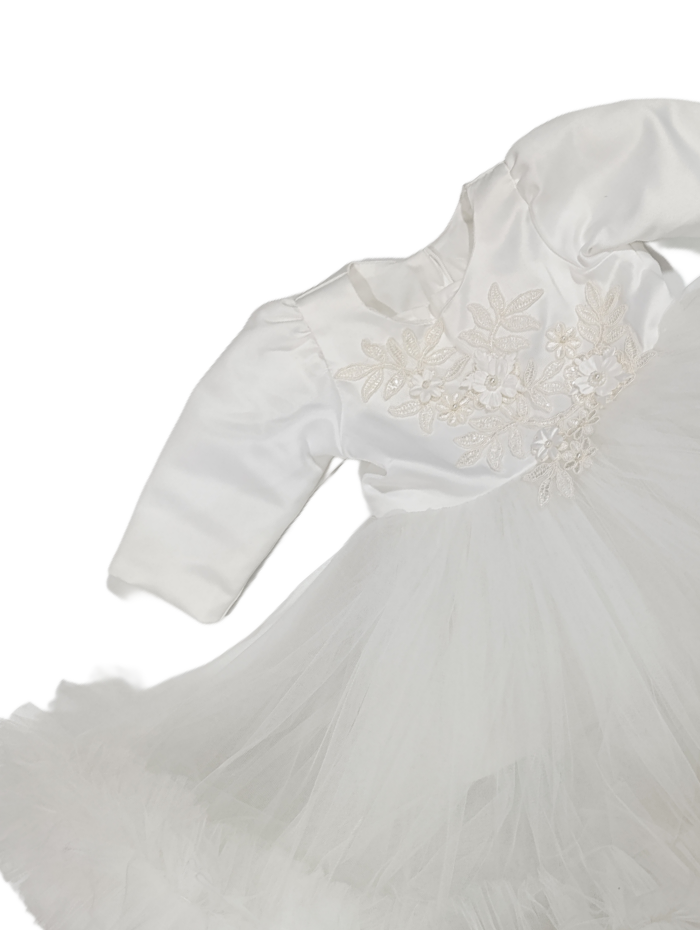 Rochița este confecționată din materiale premium, având în compoziție 85% bumbac și 15% poliester, ceea ce îi conferă o textură moale, confortabilă și ușor de întreținut. Designul său rafinat include mâneci lungi, volane din tul și aplicații florale delicate pe piept, oferind un aer distins și sofisticat.