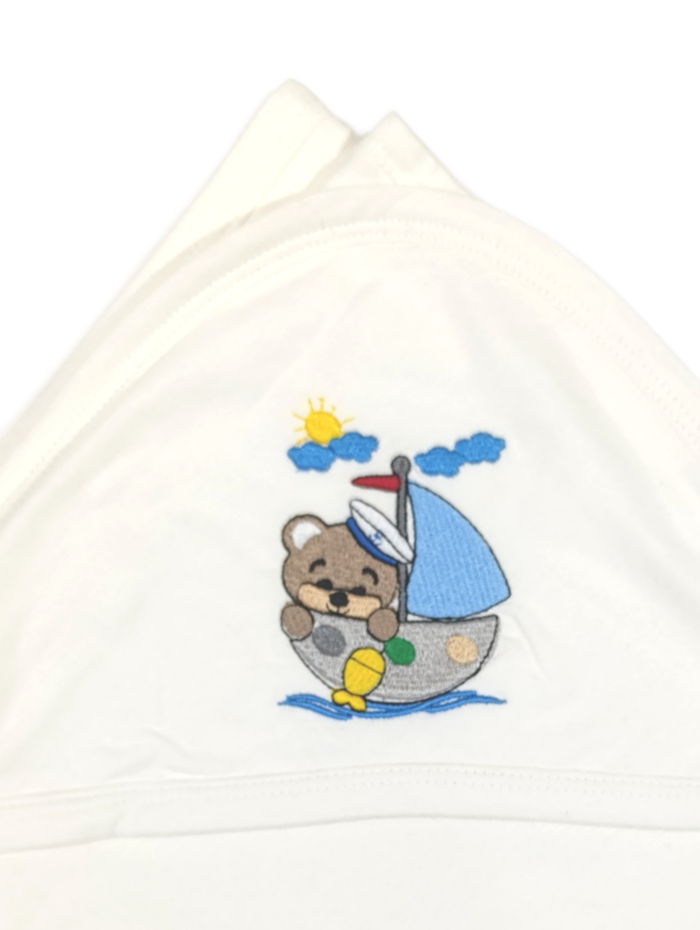 Pled brodat – pled alb de 80 x 80 cm, cu broderie albastră și mesaj personalizat, ideal pentru înfășarea copilului.